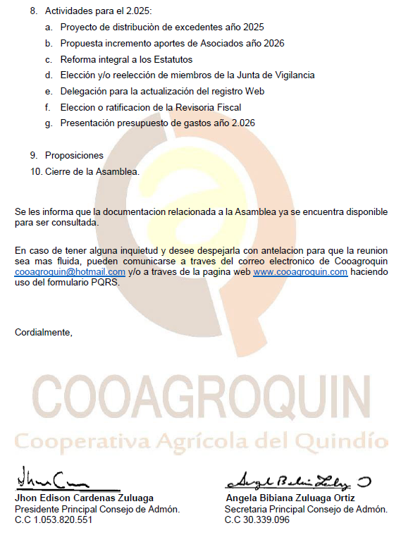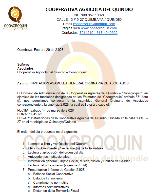 En las instalaciones de Cooagroquin, se llevó a cabo la Asamblea Anual de Asociados de la vigencia 2.024 el dia 15/03/2025, donde se aprobó el orden del día y se compartió con todos los asistentes un almuerzo.